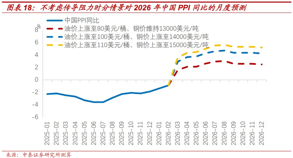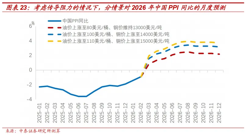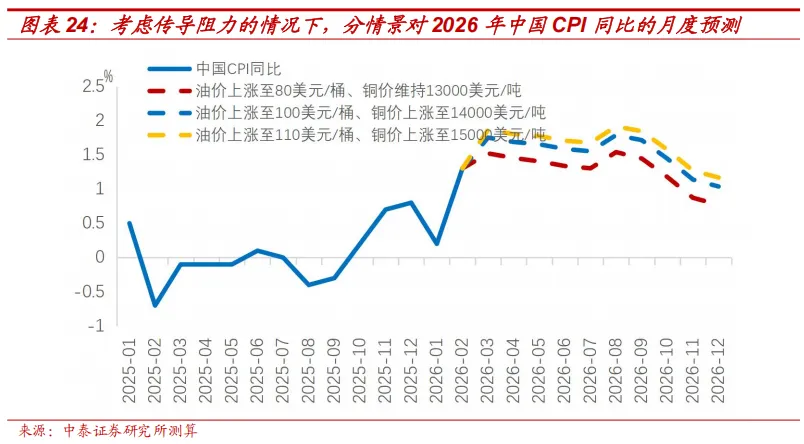 在中观情景下(油价中枢达100美元/桶、铜价中枢达14000美元/吨),2026年PPI同比中枢为3.2%,CPI同比中枢为1.8%。