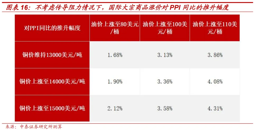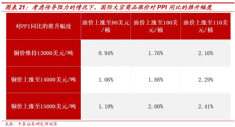 基于上述模型,通过设定油价、铜价的具体月度走势,可以测算得到,大宗商品涨价对PPI、CPI月度环比的推升幅度。