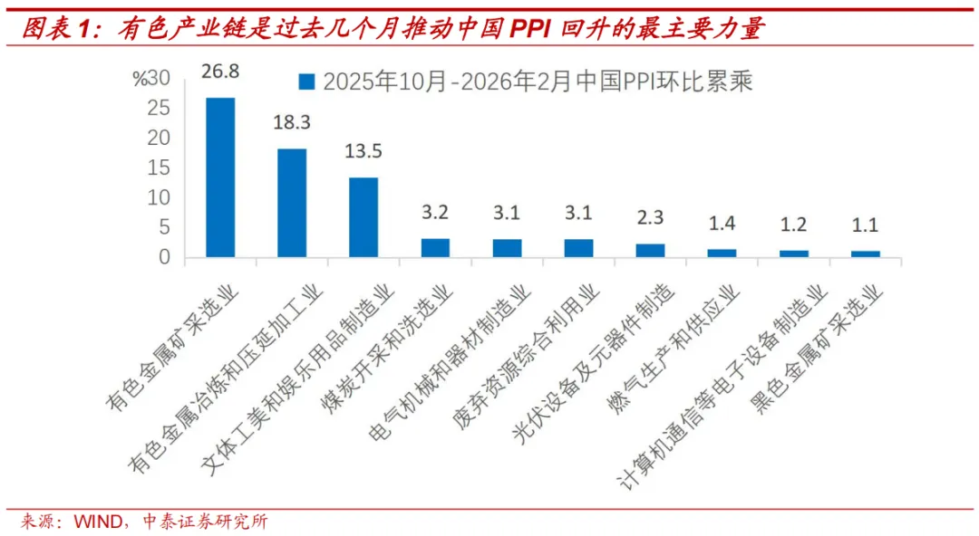 测算可知2025年10月到2026年2月,中国PPI累计上涨了1.20个百分点。其中,有色产业链贡献了1.36个百分点,贡献率达到了113%。