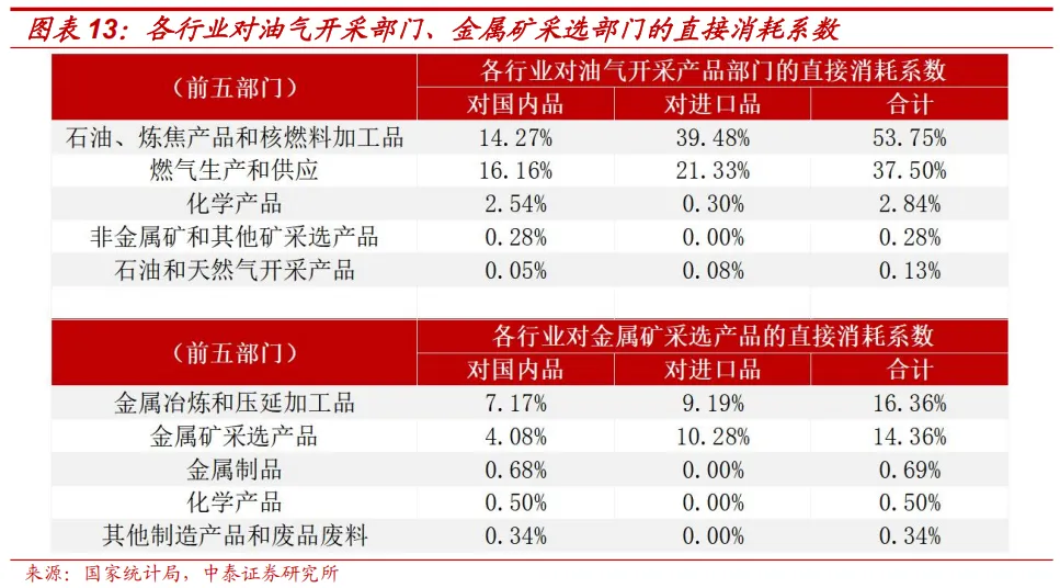 由于我们使用的是非竞争性投入产出表,因此可以分别计算得到各行业对进口产品、国内产品的直接消耗系数,以及两者加总后的合计直接消耗系数。举个简单例子,石油、炼焦产品和核燃料加工品部门对油气开采部门的合计直接消耗系数为53.75%,说明石油加工业每产出100元产品,就需要投入53.75元的油气开采产品,其中14.27元是国内油气开采产品,39.48元是进口油气开采产品。