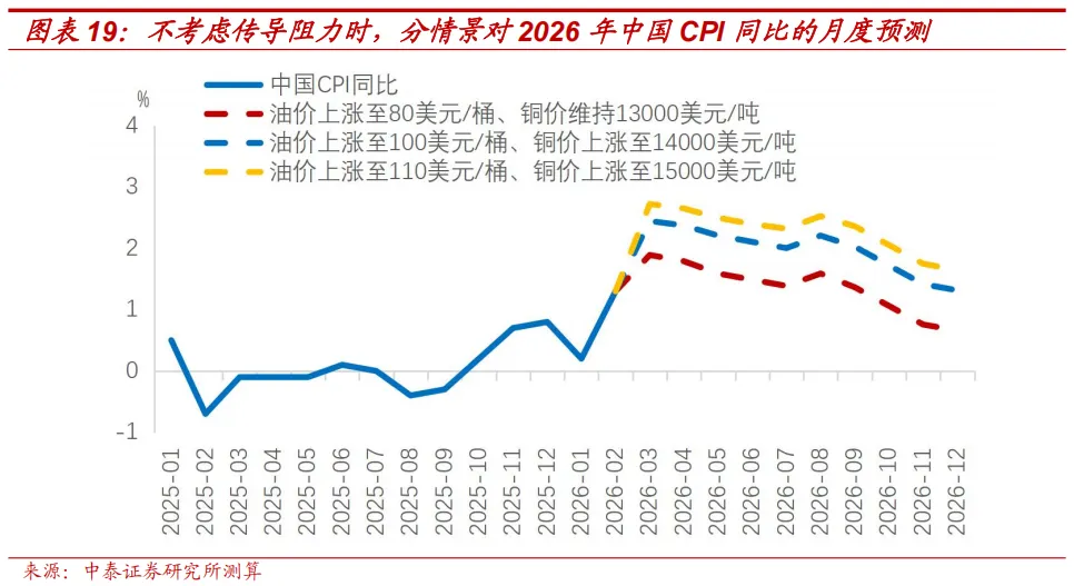 仍选取之前三种情形展示。最乐观情形下,油价中枢达80美元/桶、铜价中枢达13000美元/吨。对应2026年PPI同比中枢为1.5%,年末当月同比2.2%,年内高点为2.5%;2026年CPI同比中枢为1.2%,年末当月同比0.8%,年内高点为1.5%。