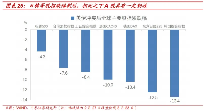 伊朗冲突爆发以来,全球市场避险情绪上升,股市普跌。其中,以日、韩为代表的国家,由于对中东油气能源和途经霍尔木兹海峡的依赖度较大,股市跌幅也比较明显。相比之下,A股的韧性相对较强。