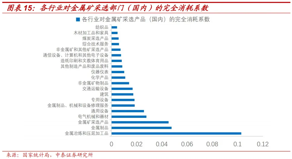 对比来看,服务业、轻工业和部分采掘业对金属矿的依赖程度极低。其中,金融业的系数仅为0.05%,教育业为0.10%,批发和零售业为0.12%,这些第三产业的运营几乎不涉及金属材料的直接大规模消耗。