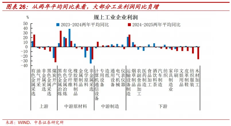 但当前终端需求疲弱,中下游企业成本转嫁空间有限,行业之间利润分配的不均衡加剧。对比2023-2024、2024-2025这两个阶段,规上企业利润呈现明显的结构性分化特征,只有上游有色金属采选、中游黑色金属冶炼、中游计算机通信设备、下游运输设备制造,这些和有色金属、黑色金属相关的行业,利润增速有显著提升。