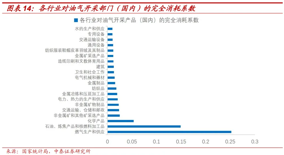 对石油和天然气开采部门消耗排名前三的行业分别是燃气生产和供应业(25.2%),石油、炼焦产品和核燃料加工品业(14.89%)以及化学产品业(5.32%)。这三项原料多源自石油化工,因此对油气的完全消耗显著高于其他行业。