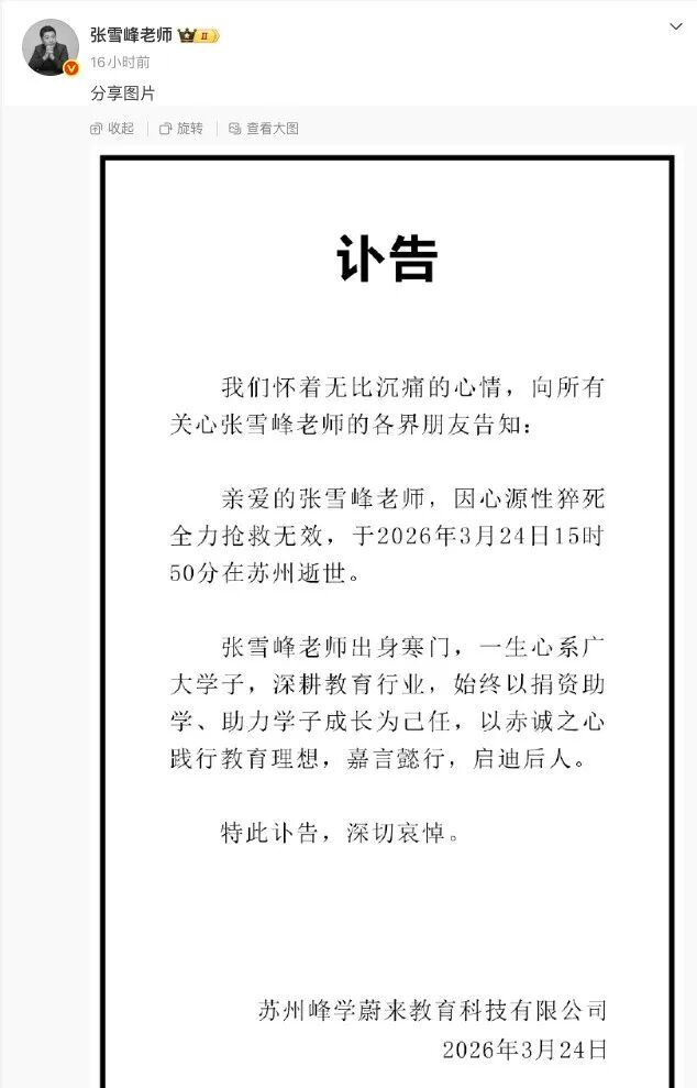 3月24日,教育领域的标志性人物张雪峰,因心源性猝死,经全力抢救无效在苏州离世,生命永远定格在41岁。