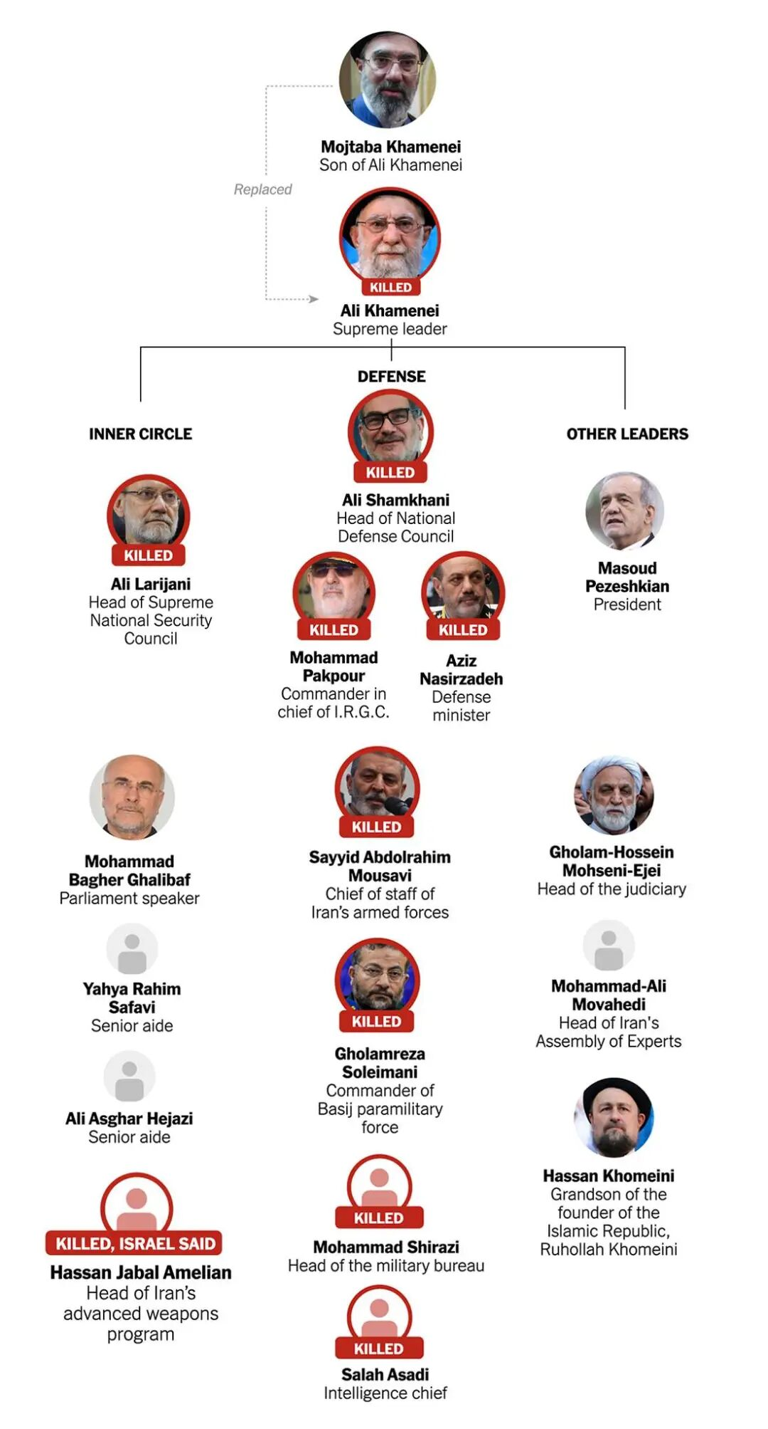 伊朗政权结构是由宗教领袖系统、军队与革命卫队、安全情报机构及若干宪制机关共同支撑的多节点网络。即便大部分军方高层被清除,仍有其他节点可以接续。