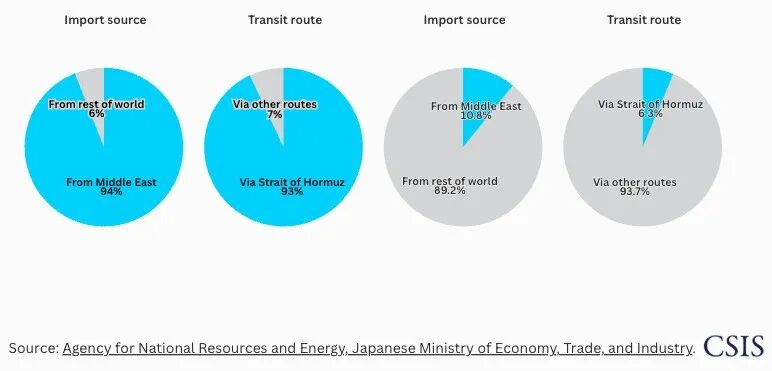 日本94%的原油进口来自中东,其中阿联酋和沙特占据绝对大头,而在运输路径上,93%的原油进口需经霍尔木兹海峡,只要海峡处于实际难以通行状态,日本原油供应将首当其冲。图源:Agency for National Resources and Energy,Japanese Ministry of Economy,Trade,and Industry.