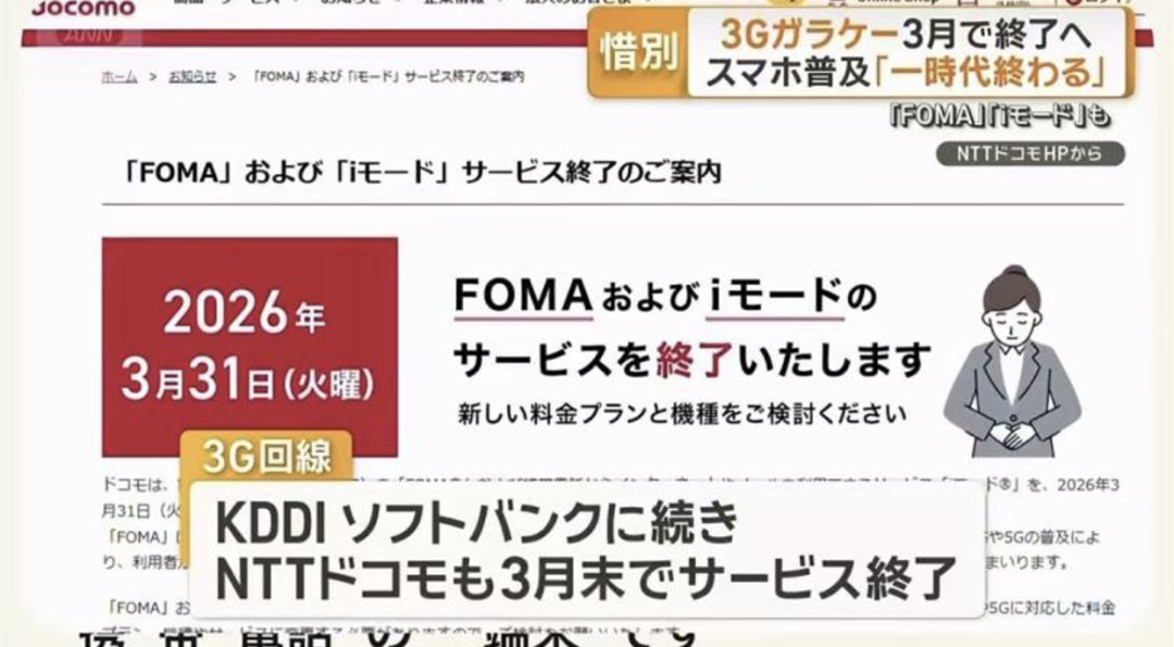 日本最大的电信运营商docomo发布公告,宣布将于2026年3月31日正式停止3G服务。继KDDI和SoftBank后,docomo的退网标志着日本翻盖机时代彻底终结,同时也掐断了极道组织成员留在旧网络里的最后一线生机。