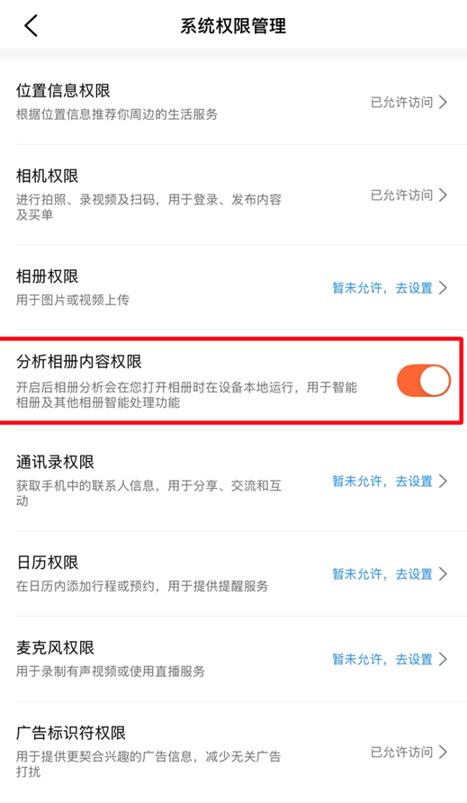 2025年2月,有大量用户反映,大众点评App默认开启“分析相册内容权限”,根据大众点评应用内的官方描述,此功能“用于智能识别及其他相册智能处理功能”,在用户打开手机相册时,会在设备本地对照片进行分析处理——识别场景与地点便于精准推荐,且关闭入口较隐蔽。这证明美团已在用户设备本地部署了轻量级AI模型,用于实时分析相册内容。