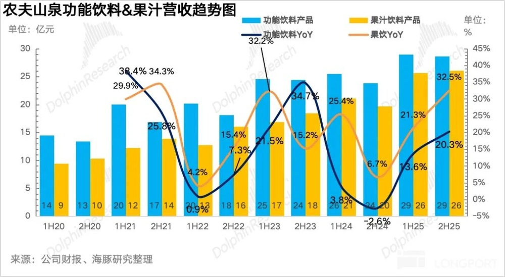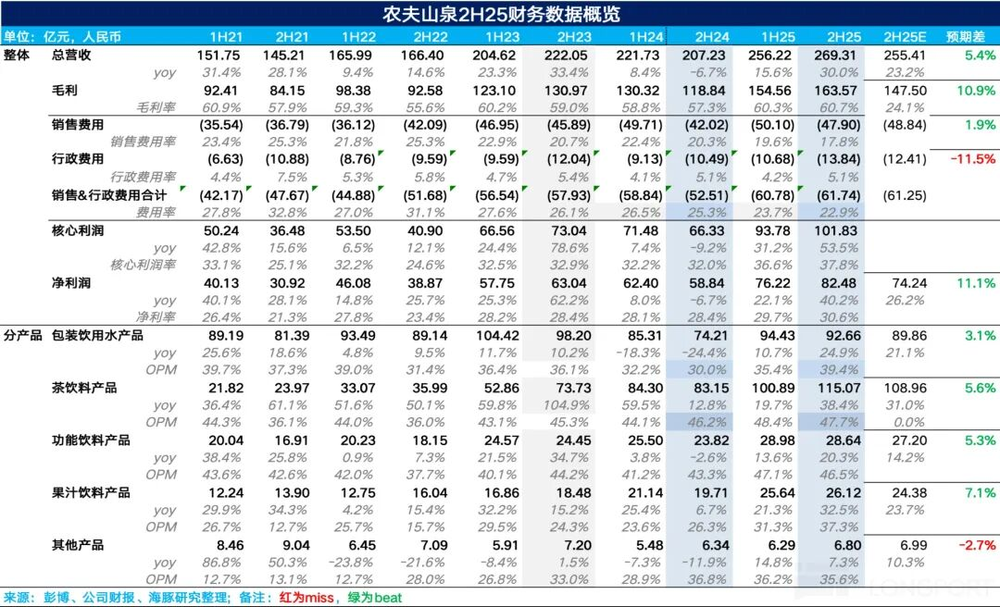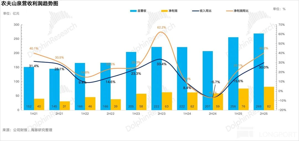 25H2公司共实现营收269.3亿元,同比增长30%,净利润82.5亿元,同比增长40%,整体上,下半年农夫在“万店陈列”高强度渠道进攻下,包装水和茶饮带动公司业绩强劲增长,另一方面,伴随公司运营能力的提升,经营杠杆释放下,利润也加速释放,是一份全面超预期的业绩。