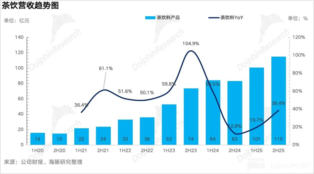 2H25茶饮业务实现营收115亿元,同比增长38.4%,收入规模正式超越包装水,成为公司的第一大增长引擎。