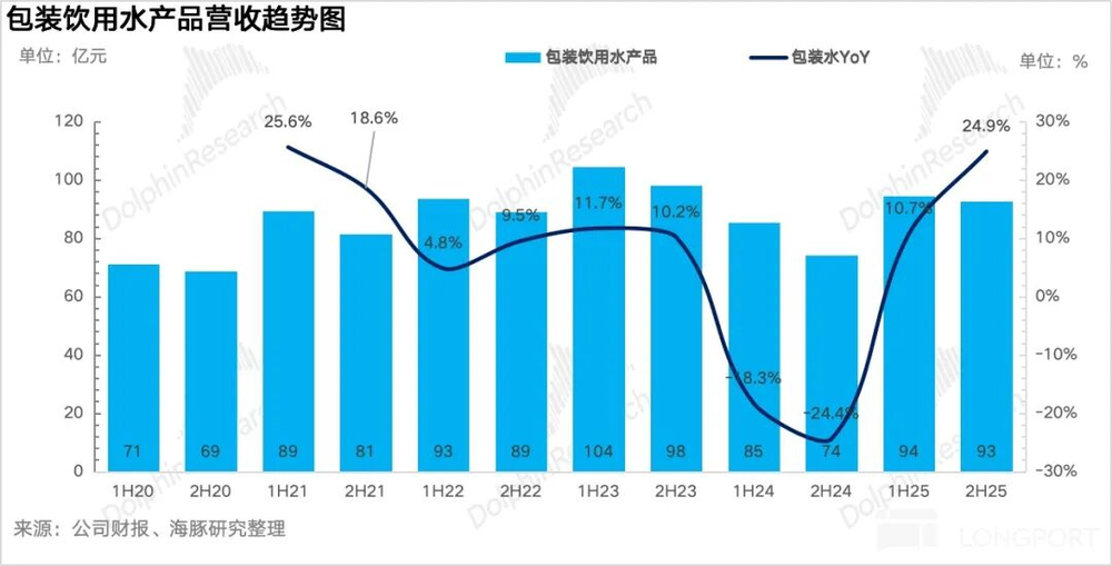25H2包装水业务实现营收92.7亿元,同比增长25%,在上半年恢复正增长后下半年环比进一步提速。