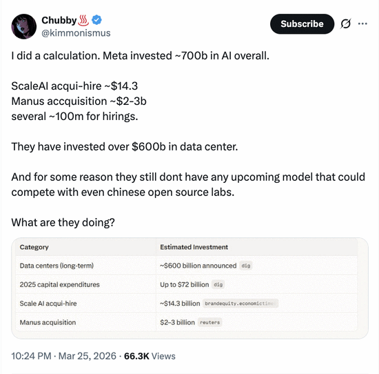 X平台上的用户粗略算了一笔账,Meta在AI上总共投资了约7000亿美元。其中包括超6000亿美元的数据中心建设、143亿美元收购ScaleAI、数十亿美元收购Manus等。