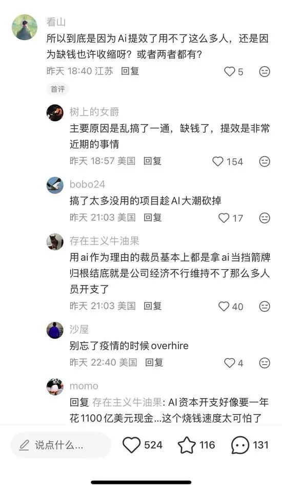 小红书上也有网友直言,Meta裁员的“主要原因是乱搞了一通,缺钱了,提效是非常近期的事情。”也有人感叹,“AI资本开支好像一年要花1100亿美元现金…这个烧钱速度太可怕了。”