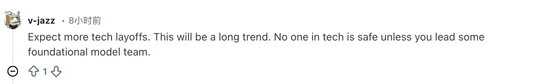 更扎心的评论来自v-jazz:“预计会有更多的科技公司裁员。这将是一个长期的趋势。在科技圈,除非你领导着某个基础模型团队,否则没人是安全的。”