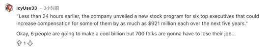一位名为IcyUse33的网友讽刺道:“不到24小时前,公司公布了一项针对6名高管的新股票计划,这可能使其中一些人在未来5年内每人的薪酬增加高达9.21亿美元。好极了,6个人要做亿万富翁了,而700个人却要丢了工作。”