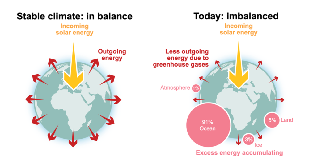 简单来说,地球从太阳吸收的能量,远远超它呼出到太空的能量,多余的热量正在被地球疯狂吸收、吞噬。