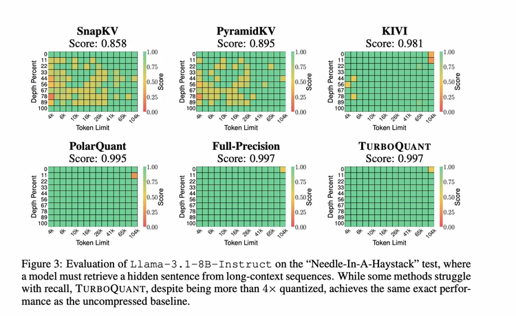 论文中做了一个测试"大模型在超长文章里找一句话的能力"。颜色越绿越好。TurboQuant压缩了4倍,颜色和不压缩完全一样。