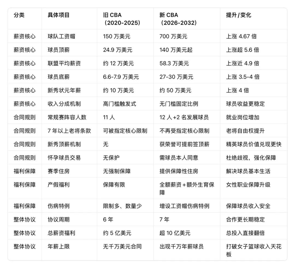 这个划时代的协议的要点包括:球员享有占WNBA总收入20%的固定分成,球队工资帽由150万美元上涨到700万美元,球员平均年薪由约12万美元增加到约60万美元,顶薪由25万美元大幅提高到140万美元起(2032年预计超过240万美元),底薪由60000多美元大幅提高到近30万美元,全面提升球员在住房、医疗、差旅、生育、养老及伤病保险等方面的保障。