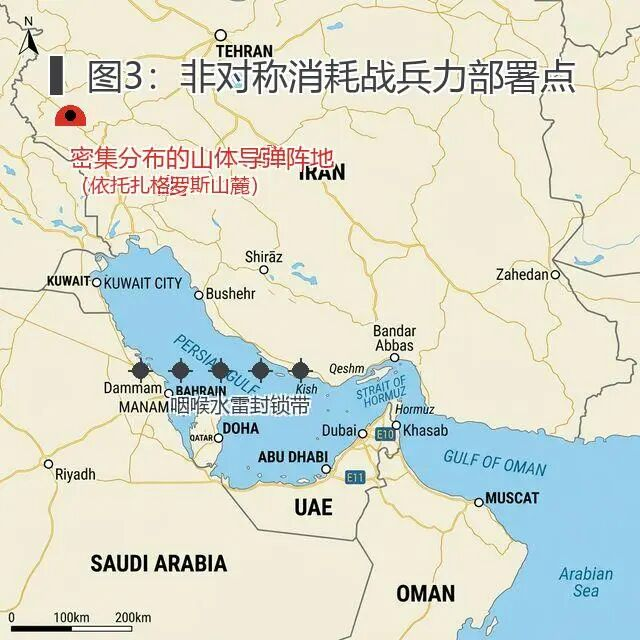 图3:依托扎格罗斯山麓的地堡、快艇狼群与水雷阵地的三位一体防御