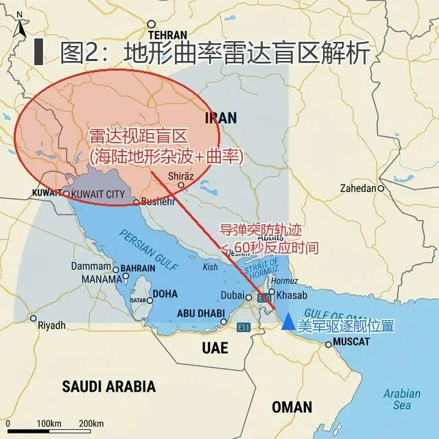 而在霍尔木兹海峡,这个100秒或40秒还要被进一步压缩。为什么?因为背景杂波。北侧是海拔一两千米的扎格罗斯山脉。神盾系统的相控阵雷达在探测时,会接收到排山倒海般的陆地回波。要把在山地背景下高速移动的导弹信号从这些杂波里抠出来,计算机需要时间过滤,这会造成极其致命的探测延迟。如果伊朗人把导弹放在山后的机动车上,利用地貌掩护,直到导弹翻过山脊俯冲向海面,美军雷达才会发现它。