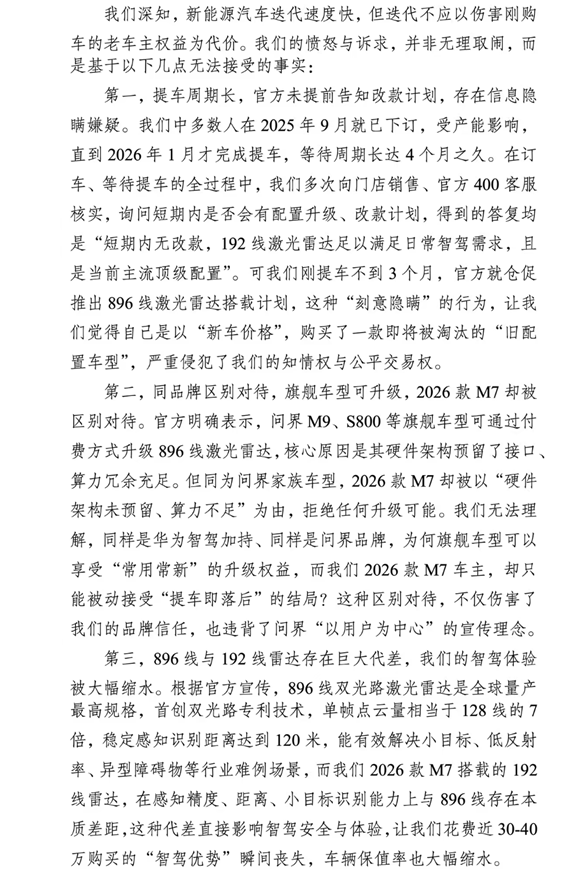 一位提车至今不足3个月的车主发文道:“尊敬的鸿蒙智行官方、赛力斯汽车相关负责人,作为信任华为技术、认可问界品牌的消费者,我们当初斥资27.98万—37.98万选购2026款M7,核心正是看中华为乾崑智驾系统的硬核实力……然而,这种‘刚提车就落后、同品牌不同待遇’的情况,让我们所有车主深感被‘背刺’,内心充满失望与愤怒。”