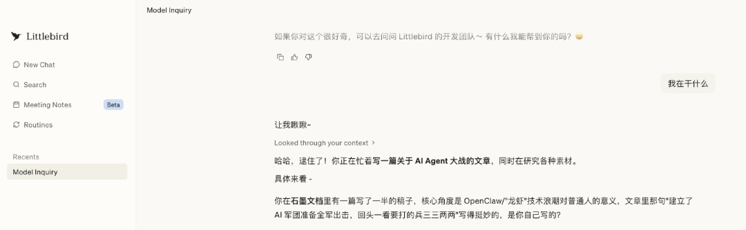 注册了Littlebird授予权限后,它确实准确讲出了我在操作的文字和信息内容。可惜的是,免费版本并不能主动搜索互联网信息,这限制了它的总结和拓展思考。犹豫过后,我决定自行在互联网搜寻信息、拓展稿件思路,感慨还是人力好用且省钱。