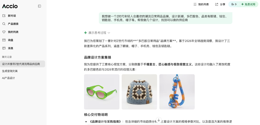 Accio全球可使用,注册送免费使用额度,我试着让AI设计潮流日常用品,接着为我找到供应商。