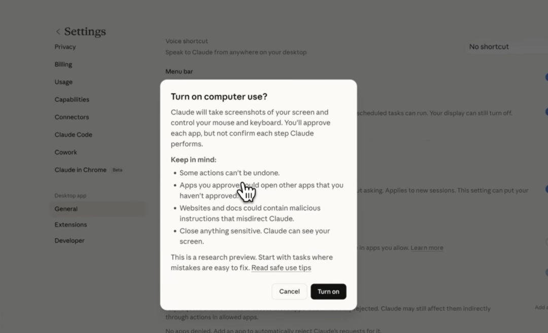 从最新的消息看起。3月24日,也就是前天,美国人工智能初创公司Anthropic发布的大型语言模型Claude发布了桌面端应用的计算机使用(computer use)功能,Claude也可以操纵电脑执行任务了(不过目前仅Pro和Max订阅用户可用)。