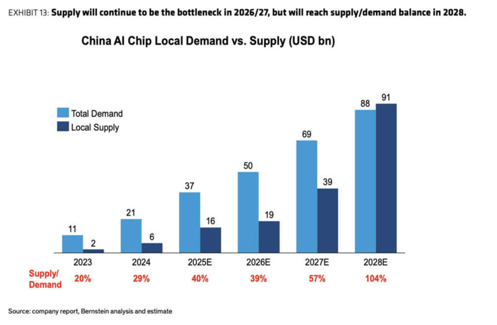 据海外投行伯恩斯坦的《中国AI芯片市场规模报告》显示,2025年中国AI芯片市场中,英伟达和华为占比差不多都是40%(英伟达稍稍领先),寒武纪、海光、阿里平头哥、百度昆仑芯等紧随其后。2026年,华为预计将占据中国AI芯片市场近50%的份额。