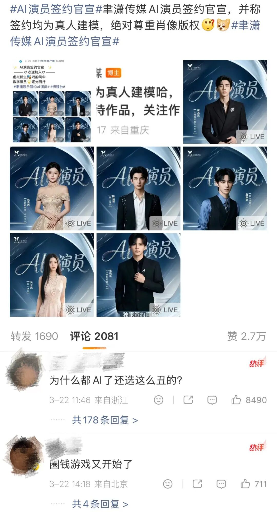 目前的确有公司落实了真人演员的AI肖像权,比如聿潇传媒官宣签约AI演员,称签约均为真人建模、绝对尊重肖像版权,其中还包含经常出现在大众视野的网红韩安冉。然而从网友评论来看,依然有大量观众不买账。有网友质疑真人演员的AI形象未必具有美观性,也有人质疑此举不过是“挣快钱”。