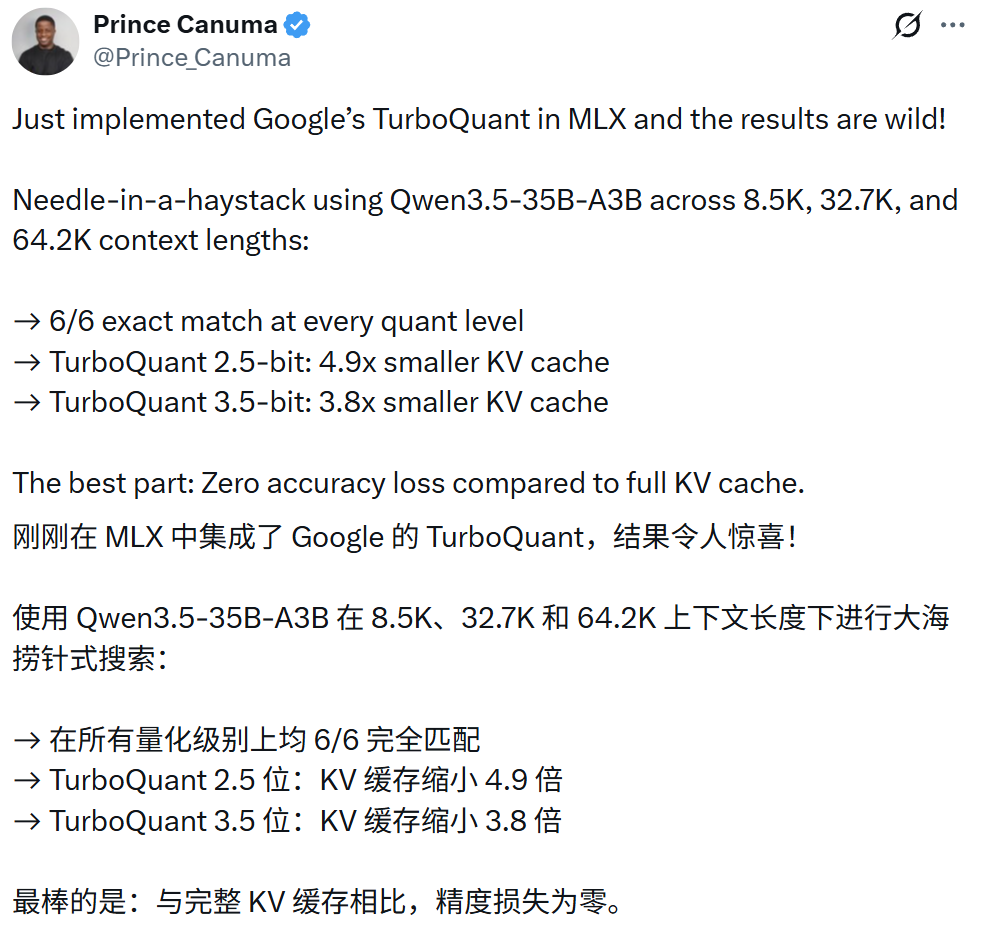 在另一个实现案例中,研究者在苹果MLX中实现了TurboQuant,同样效果卓绝!