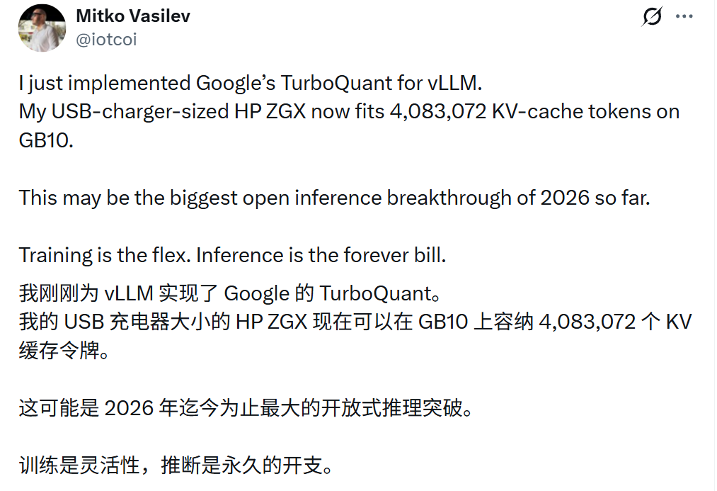 也已经有工程师成功了为vLLM实现了TurboQuant并验证了其效果。他惊喜地分享说:「我那USB充电器大小的HP ZGX现在可以在GB10上容纳4,083,072个KV缓存token。这可能是2026年迄今为止最大的开放式推理突破。」