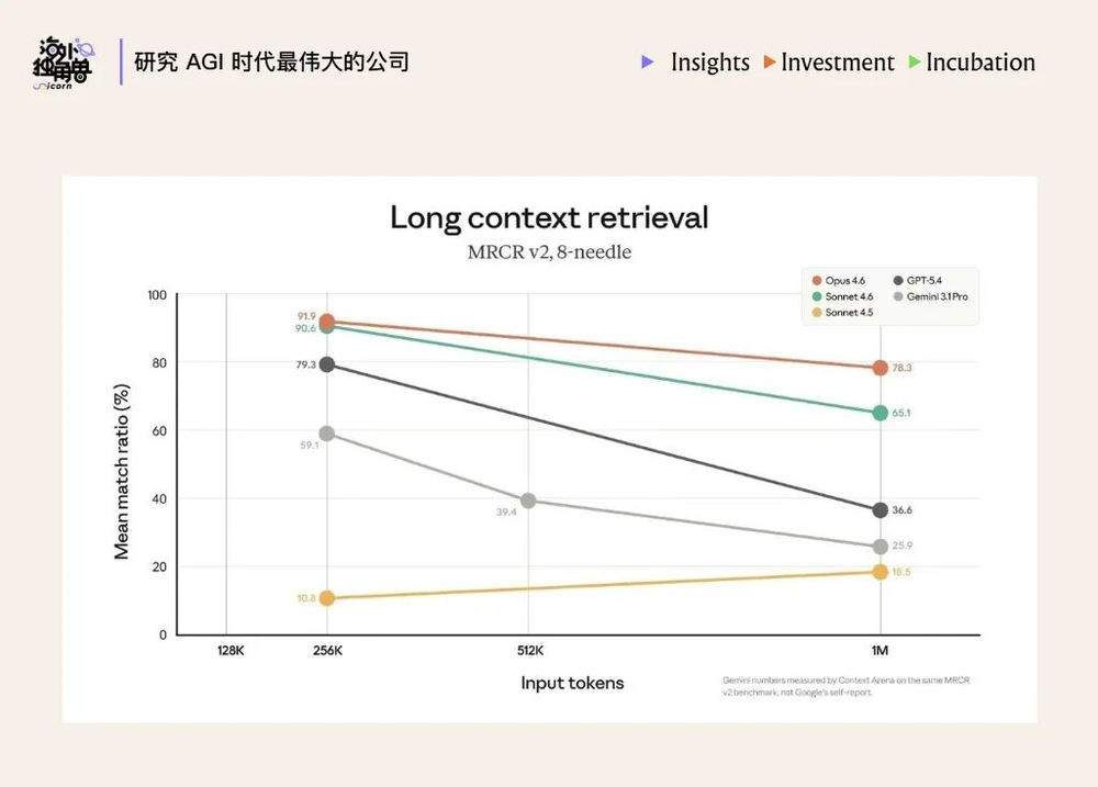 表现最好的模型(Opus 4.6系列),长上下文下还能维持七成的检索命中率,表现没那么稳的模型(GPT-5.4、Gemini 3.1 Pro),命中率会直接掉到三成。