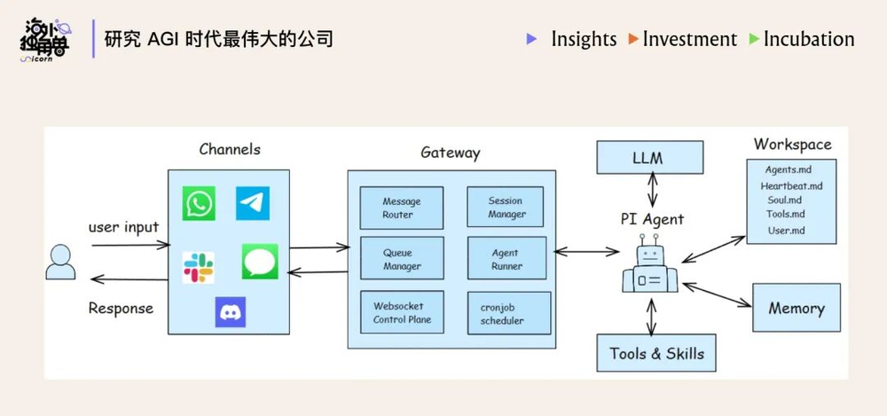 •Gateway负责破壁,它把WhatsApp、Discord等社交软件统一对接给了模型,让小龙虾能像朋友一样出没在任意窗口。