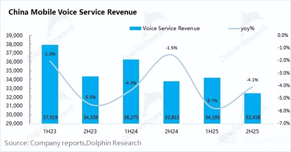 中国移动流量业务2025年下半年收入1736亿元,同比下滑4%。在短视频等需求的带动下,流量使用量继续增加,但单位资费依然下滑,最终导致流量业务的继续下滑。