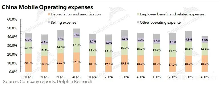 中国移动2025年第四季度经营费用1059亿元,同比增长下滑4.9%。海豚君将“销售费用”、“雇员薪酬费用”、“折旧及摊销”和“其他营运支出”四项都放在经营费用中;