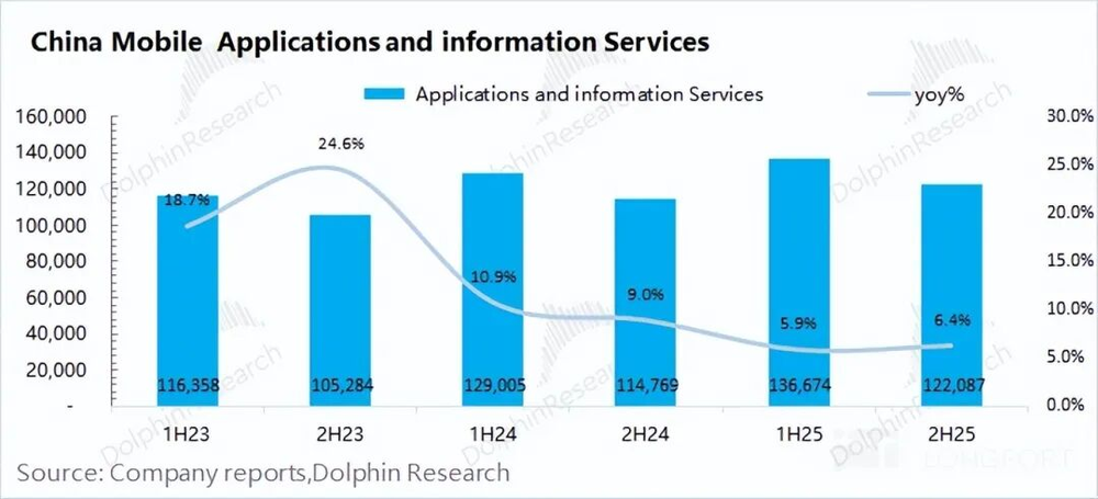 3)应用及信息服务业务:公司2025年下半年实现收入1221亿元,同比增长6%。这一业务板块中主要包含了个人数字内容与应用(娱乐与生活)、智慧家庭业务(数字家庭中心)、企业数字化服务(政企信息服务)等方面。