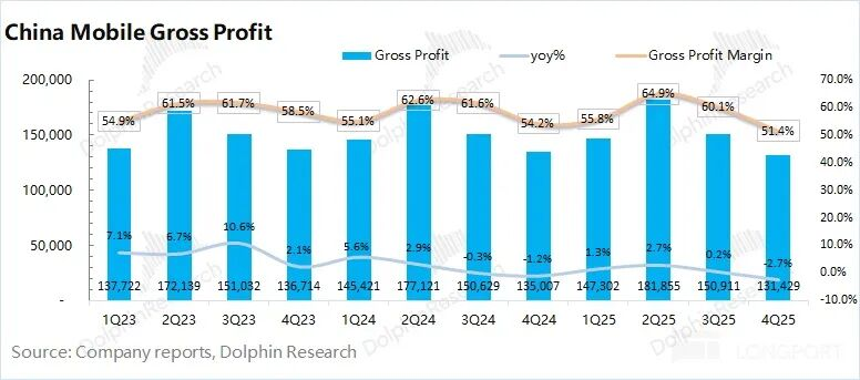 中国移动2025年第四季度毛利率51.4%,同比下滑3.8 pct。海豚君将“网络运营及支撑成本”和“销售产品成本”列为营业成本,进而测算公司毛利及毛利率情况。