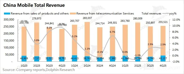 中国移动2025年第四季度总营收2555亿元,同比增长2.5%。分项来看,其中公司本季度来自于通讯服务的收入为2124亿元,同比微增0.5%;来自产品销售及其他的收入为431亿元,同比增长14%。