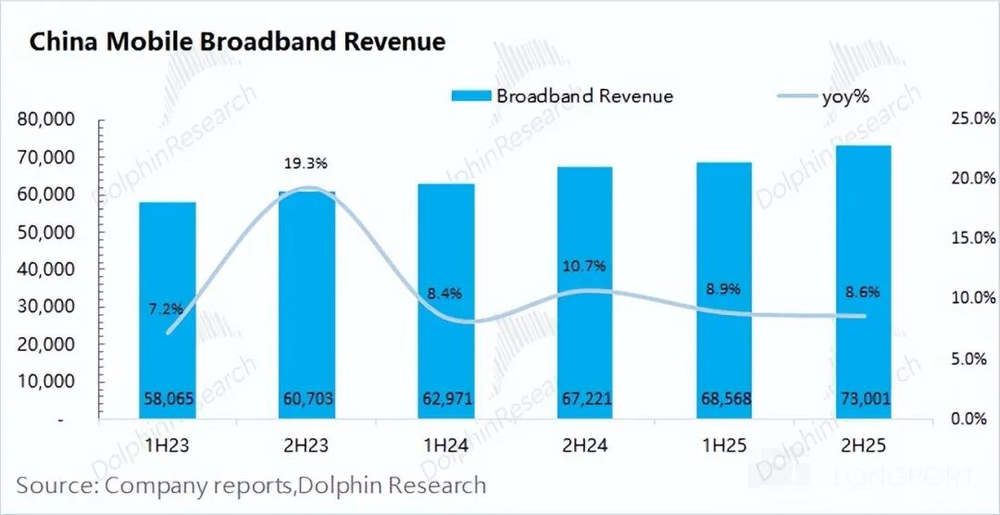 中国移动宽带业务2025年下半年收入730亿元,同比增长8.6%。公司的宽带业务继续维持增长的态势,主要得益于公司在宽带市场份额的增加。