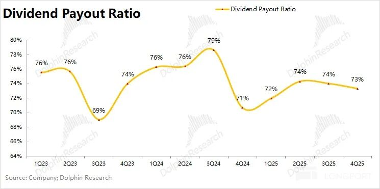 b)分红情况:由于公司通常在二季度/三季度进行分红,2025年合计分红1042亿元左右,估算公司的股息支付率维持在72%上方。