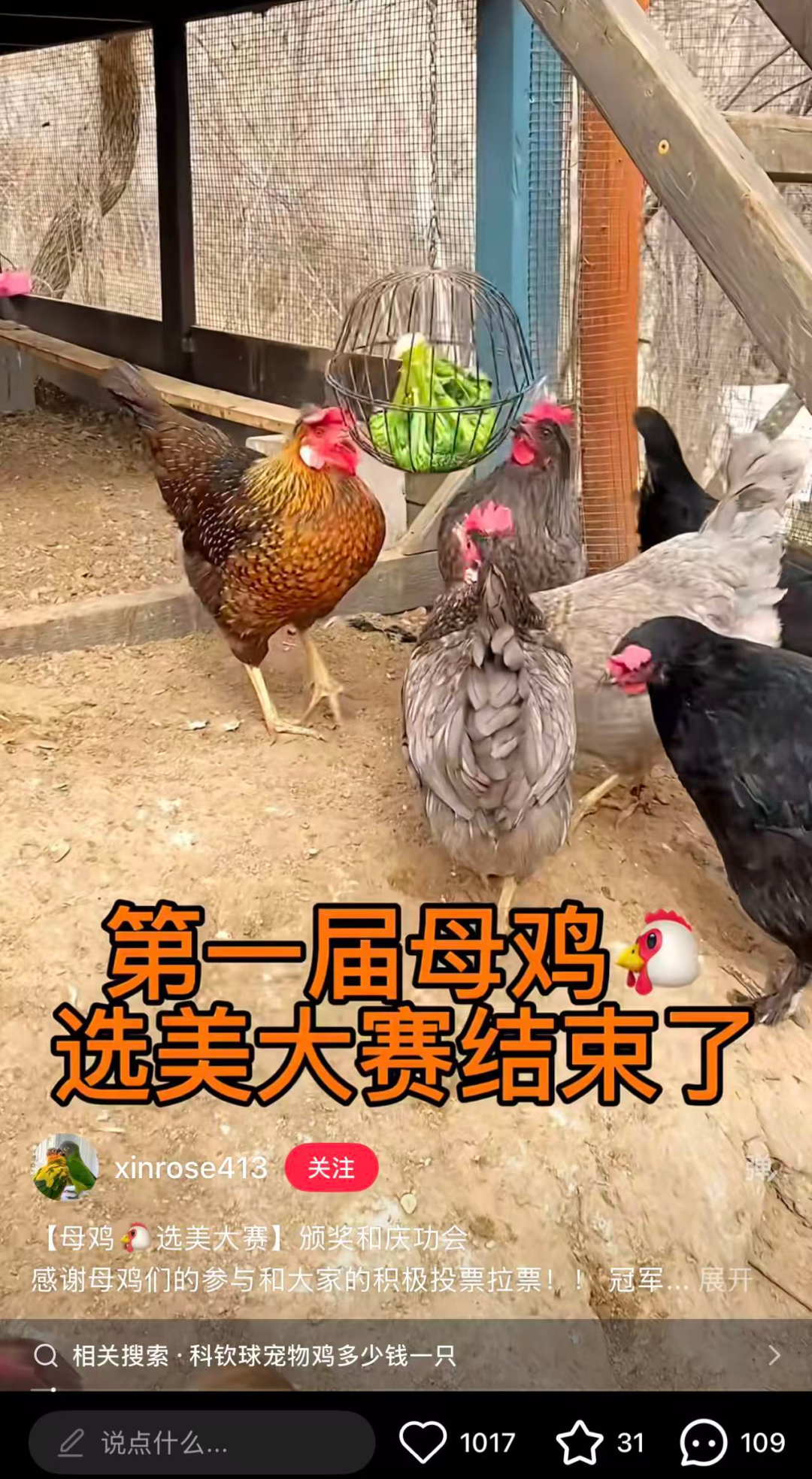 不仅如此,线上线下都出现了许多“赏鸡”的活动。比如说,线上由博主@xinrose413举办的“决战美鸡之巅”,让网友们票选出最美的母鸡;