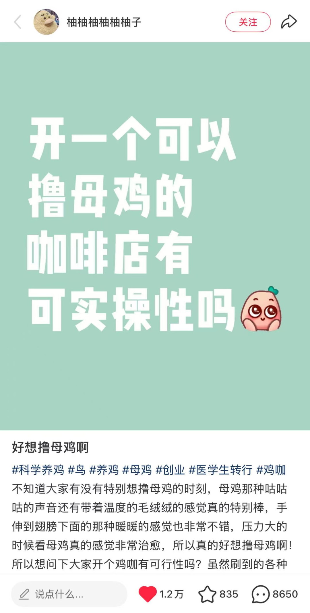 而没有养鸡条件又想“吸”鸡的,或许就会像博主@柚柚柚柚柚柚子一样,幻想着能有一家可以撸鸡的“母鸡咖”出现。目前,已有1.2万网友对这一前卫想法表示了赞同。