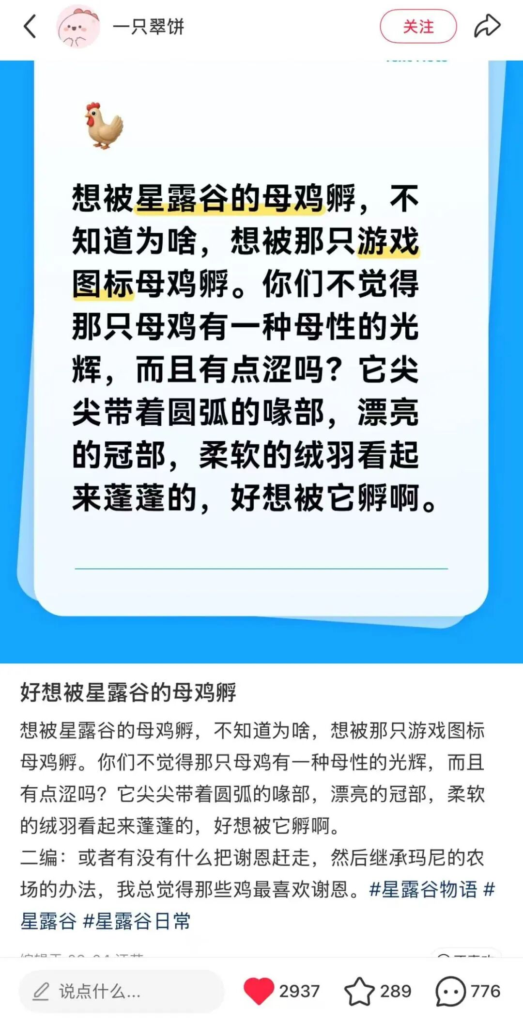 或许,只是纯粹地被鸡那种笨拙又治愈的气质给蛊惑了;或许,是像我一样太沉迷《星露谷》结果不慎被小鸡毒唯谢恩给洗脑了;