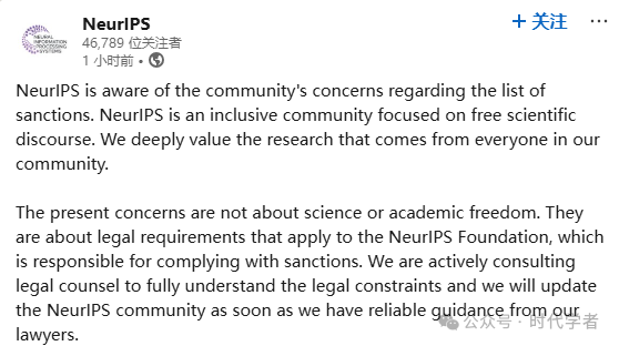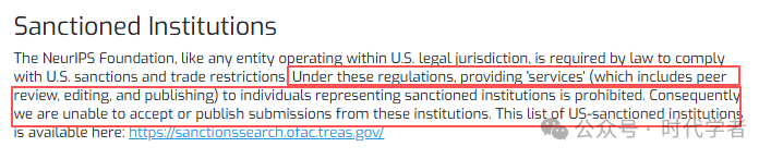 NeurIPS宣布无法向受制裁实体的代表提供包括“同行评审、编辑和出版”在内的任何“学术服务”。这一政策直接打击了包括华为、商汤、旷视,以及近年被列入名单的多所中国顶尖高校(如哈工大、北航)和研究机构(如北京智源人工智能研究院BAAI)。
