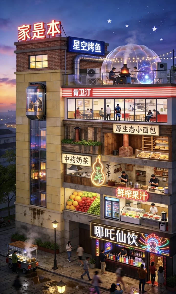 有人租下六层塔楼,投入百万立志于搭建属于自己的“奶茶大厦”,一二楼是不知名奶茶店,三四楼是棋牌室,六楼是得手脚并用爬上去的网红打卡点。五楼则想搞成复古零食店,想去买点小零食,还得坐电梯。商业逻辑像拼乐高,层层叠加,但在哪一层楼,你都找不到顾客。