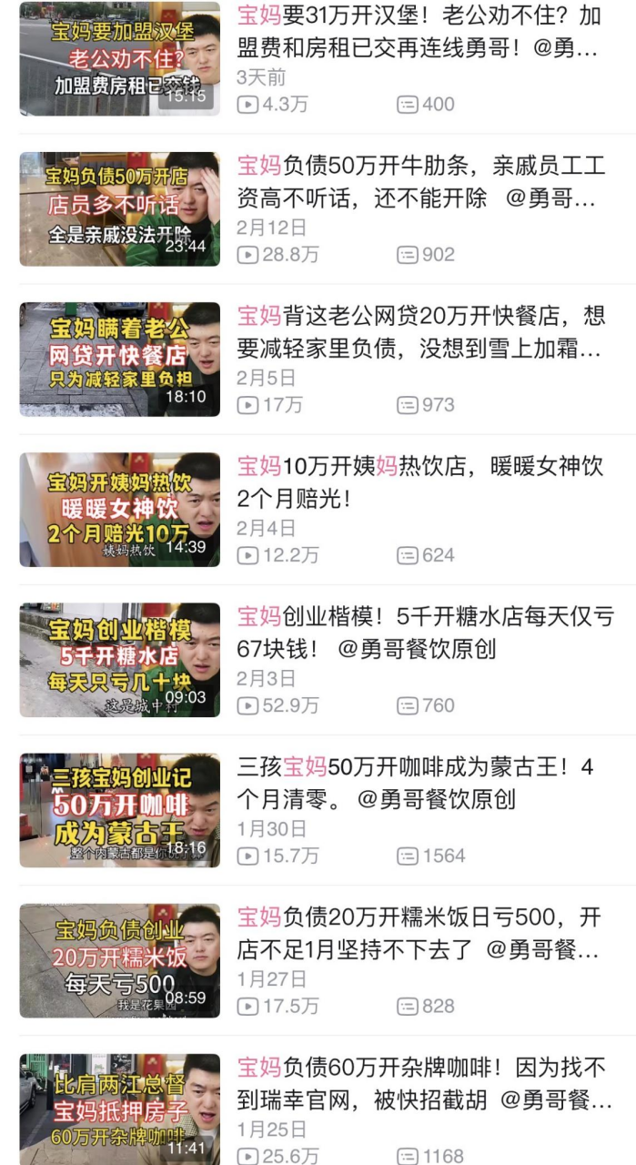 勇哥本深耕餐饮业,在开启自媒体生涯后,便增加了一个业务,只需要300-500块,就可以连麦勇哥,对着自己的店铺360度转一圈后,勇哥在线给你的业务“把脉”,给出增加营利的实在建议。