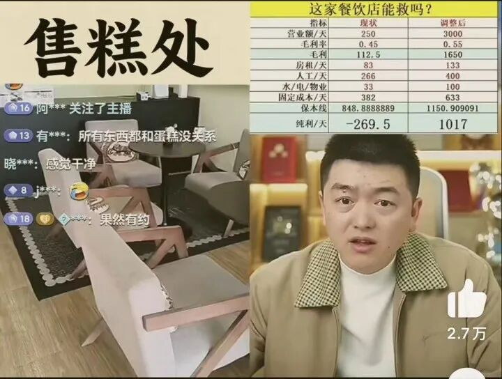 但若内容只是揭露骗局,这个如此垂直的餐饮直播连线,不会广泛出圈到全网玩梗的程度。如果说前面的案例还有一种荒诞的幽默感,下面的这个,就只剩荒诞。